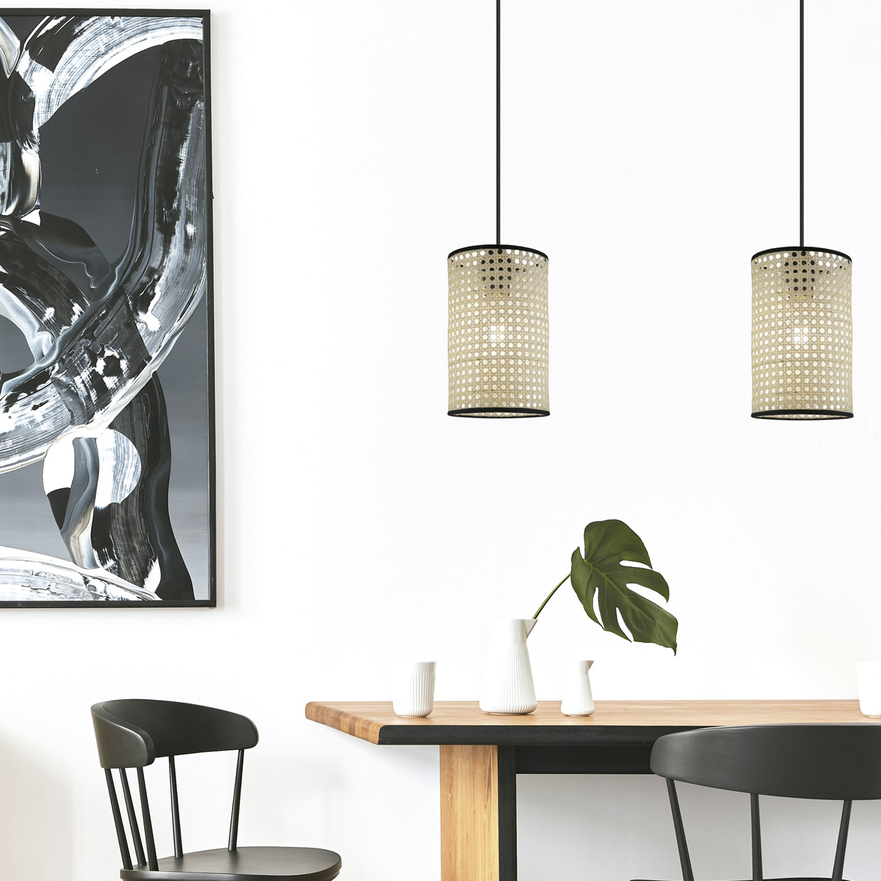Lámpara colgante de la Colección DAFNE en rejilla de natural. Compatible con bombillas Led E-27 (no incluidas) 1 x E-27 60W Max. Fabricado en mimbre de color natural y metal y base acrílica de color negro. Superposiciones, tonos ocres, pasteles o t