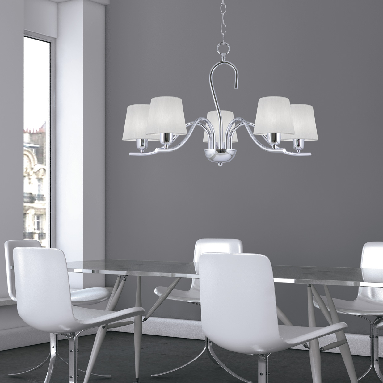 Lámpara colgante de la Colección NATALIE fabricada en España. Cuerpo de metal en acabado cromo y pantallas de tela. Usa bombilla E-14 (no incluida) compatibles con bombillas Led. Es una elegante y estilizada propuesta, que se conjuga con generosas