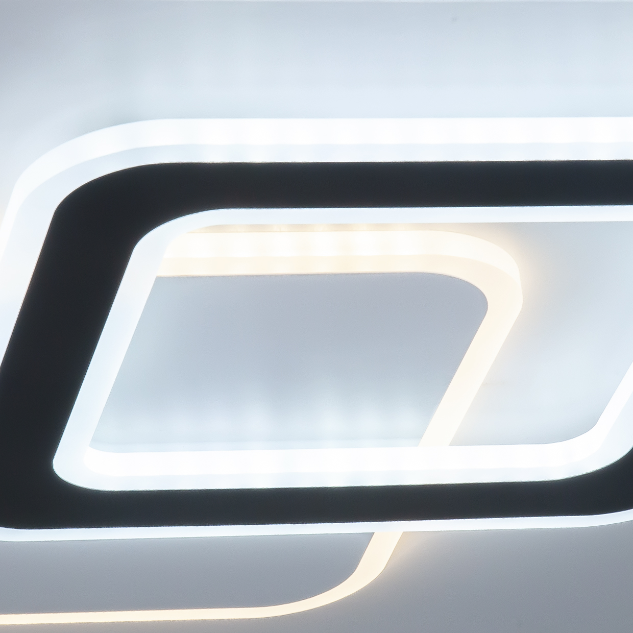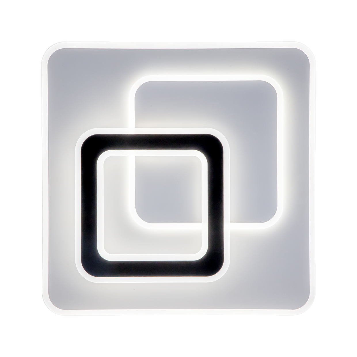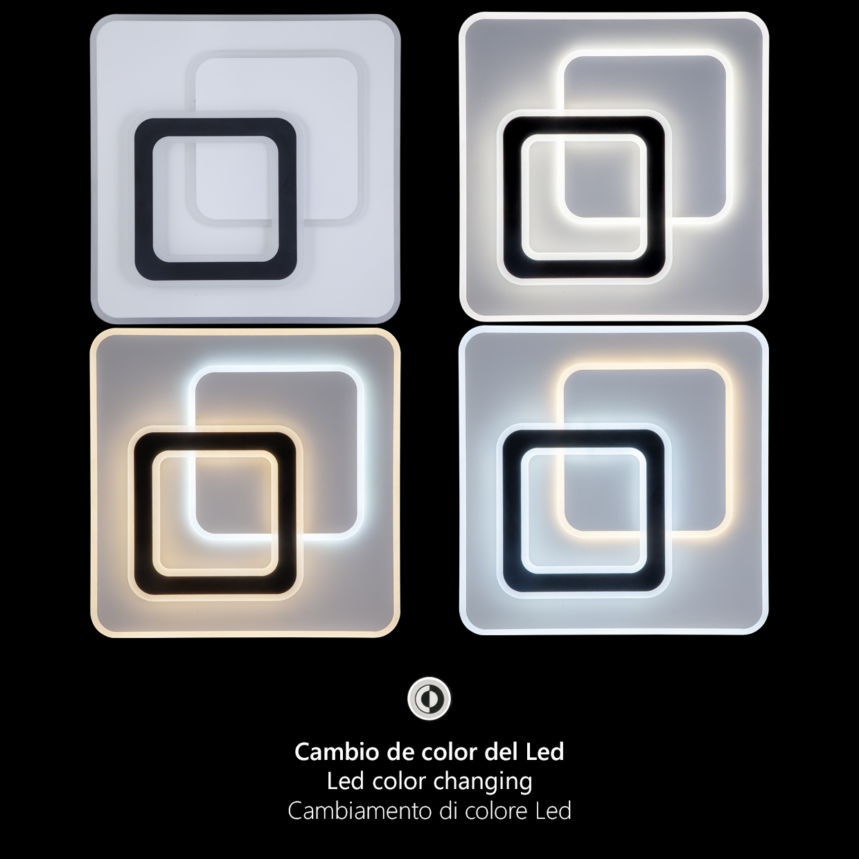 Plafón de techo LED de la Colección LORIA (48W 4560LM 2700-6500K). Fabricado en metal y metacrilato. Con un diseño en el que formas geométricas, una en blanco y otra en negro. Un plafón LED regulable desde su mando a distancia, y desde donde podemos